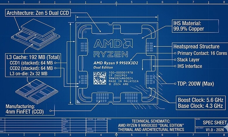 The secret weapon in this generation is the 2nd Generation 3D V-Cache. In previous years, the cache was stacked on top of the CPU cores, creating a thermal “blanket” that forced AMD to lower clock speeds. With the 9000X3D series, AMD “flipped the script.” The 3D V-Cache is now positioned underneath the Core Complex Die (CCD). This allows the heat-generating cores to sit directly against the cooler, allowing the Ryzen 9 9950X3D2 to maintain a massive 5.6 GHz boost clock while carrying a staggering 192 MB of L3 cache.