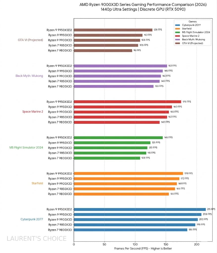 As seen in the technical blueprint below, the 9950X3D2 delivers a “knockout blow” in titles like MS Flight Simulator 2024, where it hits 145 FPS, and the upcoming GTA VI, where it reaches a projected 128 FPS. It effectively removes the 1% low stutters that plague even the fastest Intel Core Ultra 200S processors.