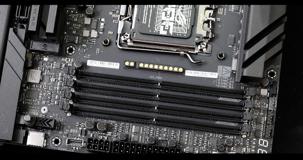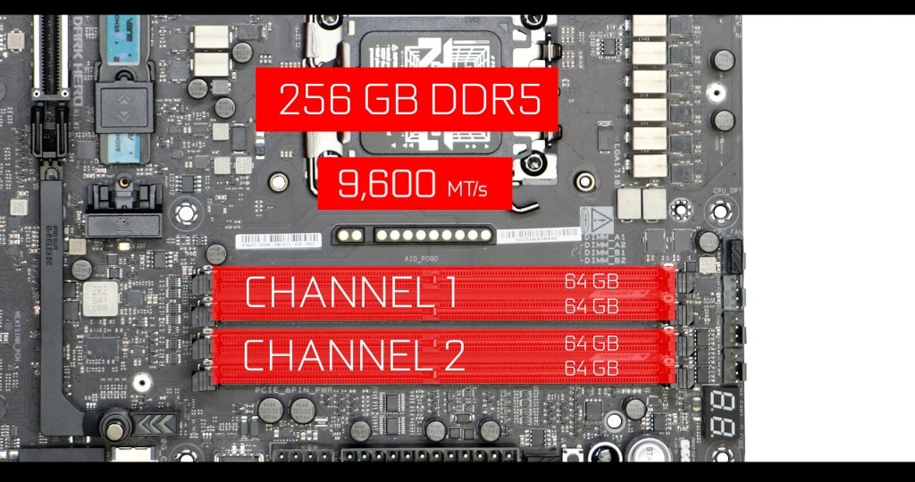 The DARK HERO supports the usual 256 GB of DDR5 RAM, organized in a dual channel configuration ( upto 64 GB per slot, 128 GB per channel ).