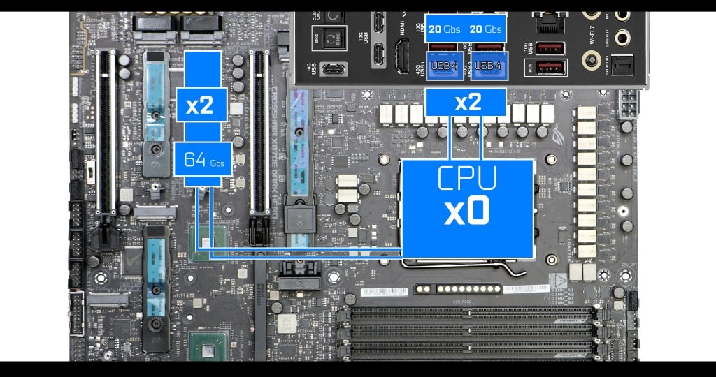 Our Secondary PCIe 5.0 NVMe and our back IO USB 4.0s do share 4 PCIe 5.0 Lanes. As shown above, out of the box, they are configured to share the lanes equally, availing half of the advertised bandwidth to each of them.