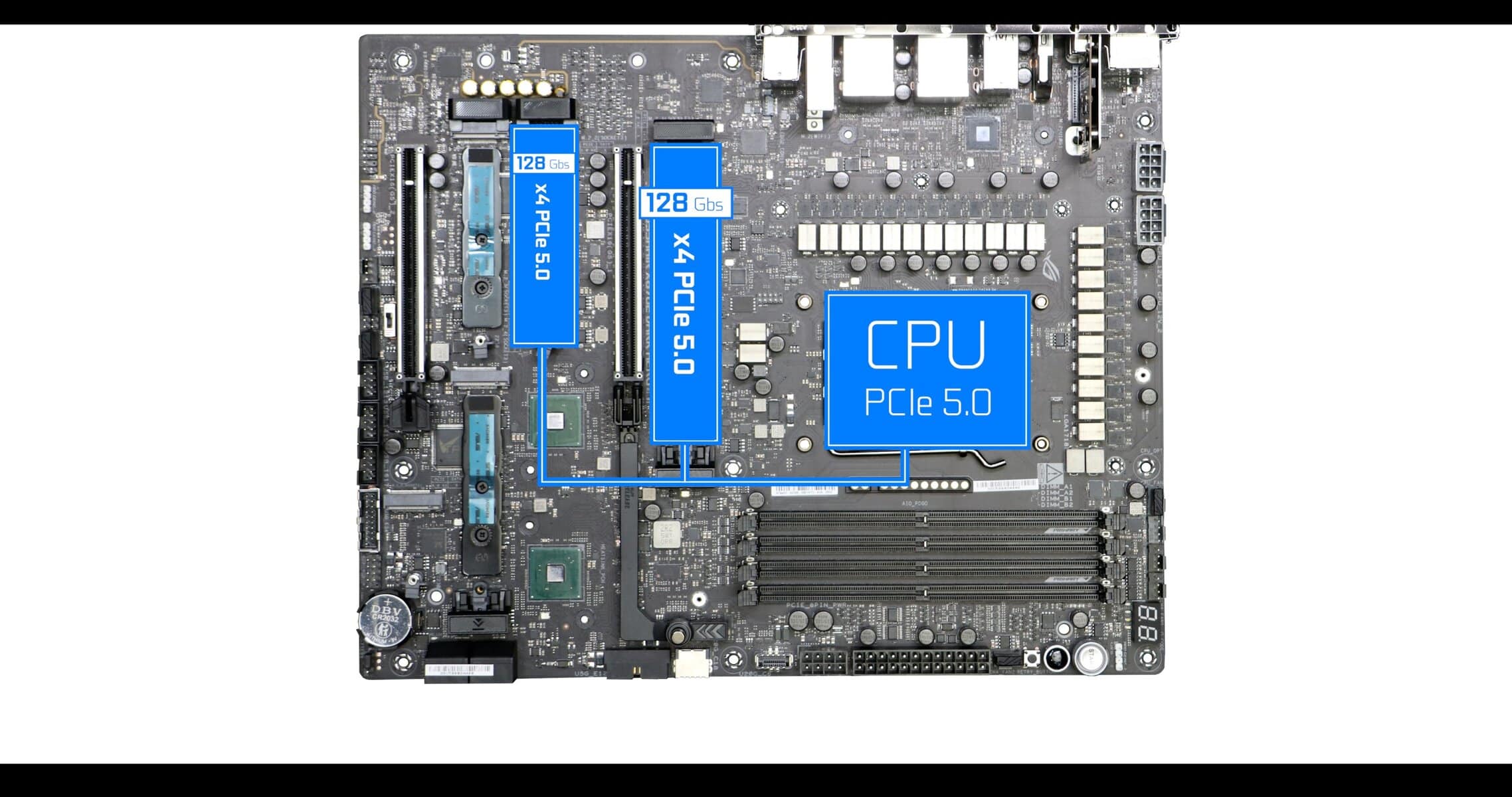 In a single GPU configuration, our closest Export to the GPU is the only one populated with 16 PCIe 5.0 lanes, for a 64 GBs worth of bandwidth each way.