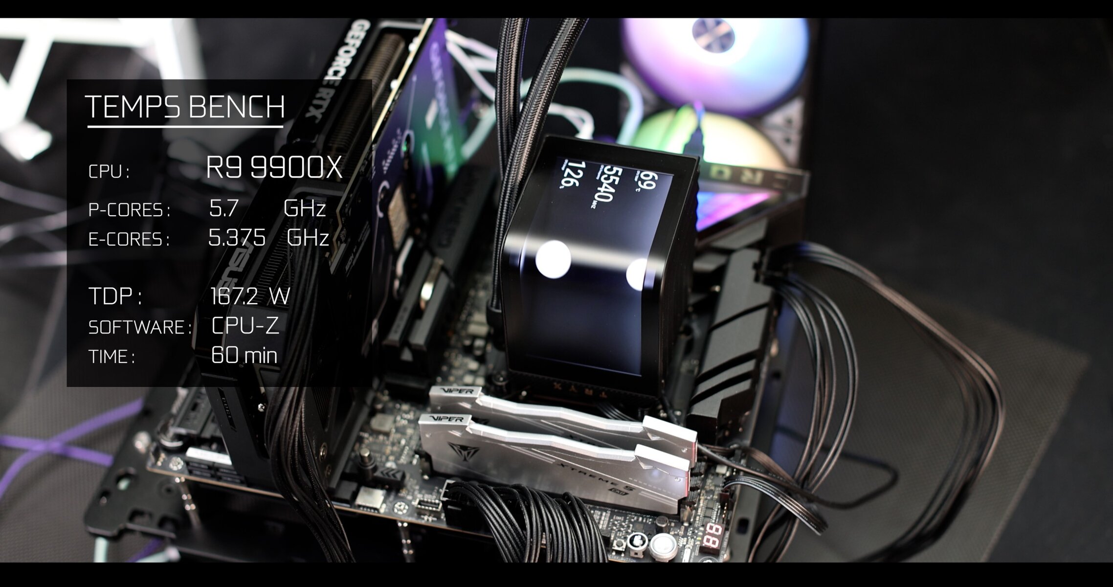 CPU chosen for the test is a RYZEN R9 9900X, 12 Cores, with 6 Performance Cores set at 5.7 GHz, and 6 Efficient-Cores set at 5.375 GHz